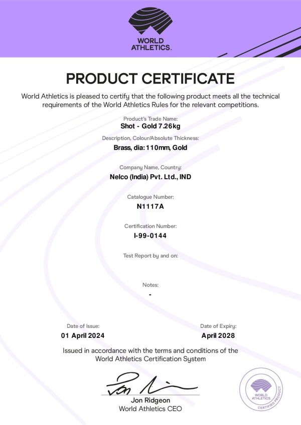 Rust proof and strong. Brass shell filled with lead. Precision machine tuned to different specifications to meet with World Athletics(WA) Standards.